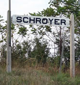 Schroyer. Founded in 1886 by settlers named Shroyer. After a sign painter inserted a “c” by mistake on the sign for the depot, the railroad refused to correct it. Nothing remains of the town now but the depot sign, mounted on poles by the road. The site itself is private property. About 7/10 mile north of Alcove Spring on the East River Road. View Map